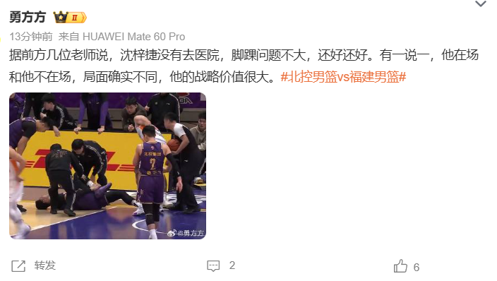 那么说,沈梓捷的伤情严不严重?赛后第一时间,媒体人勇方方更新的报道,好消息是,沈梓捷没有去医院,脚踝问题不大。