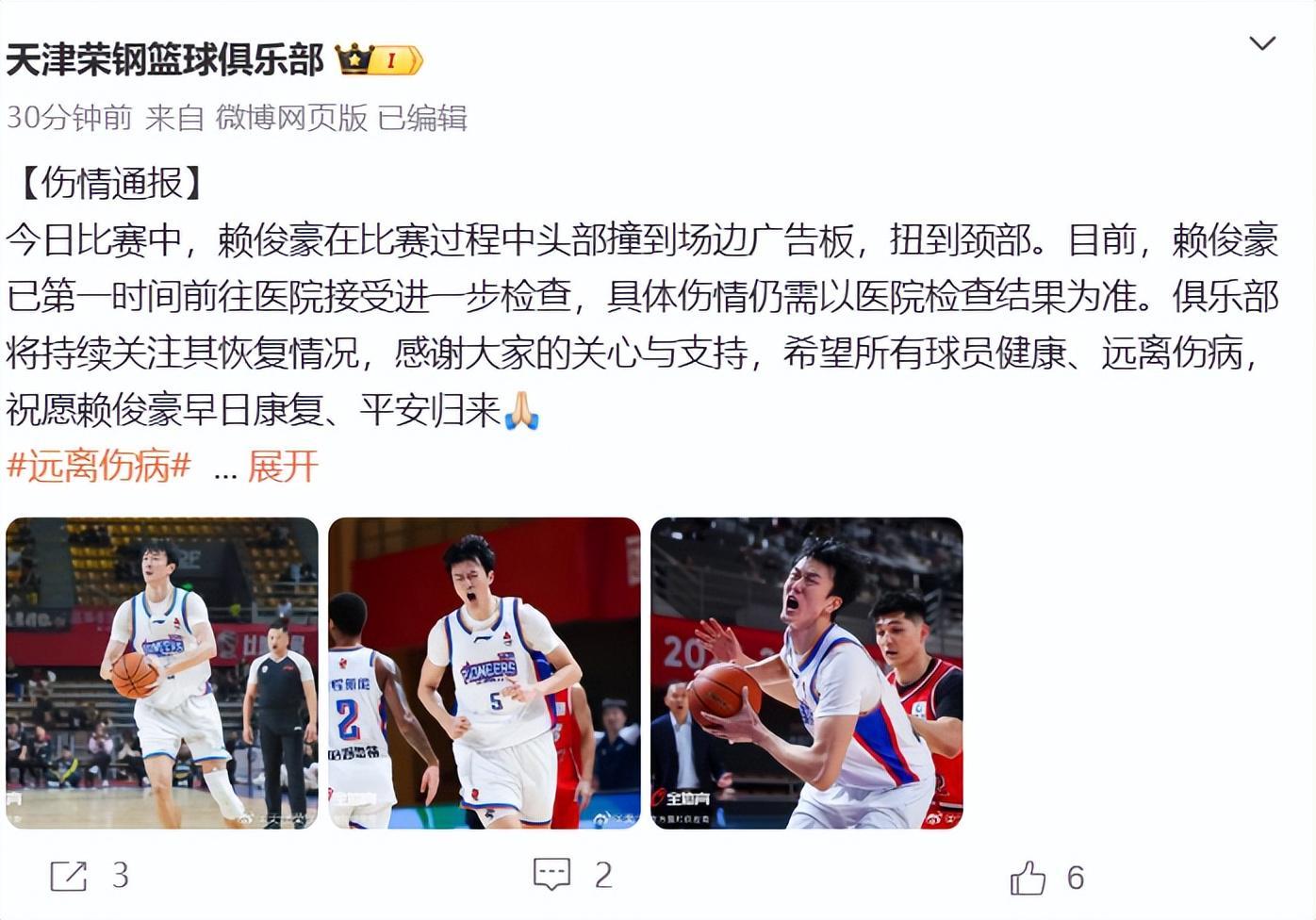 天津男篮官方第一时间发布了伤情公告,赖俊豪在比赛过程中头部撞到场边广告板,扭到颈部,具体伤情仍需以医院检查为准。